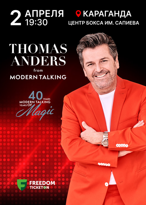 Поклонники легендарной группы Modern Talking, приготовьтесь к самому незабываемому событию в Вашем городе . Золотой голос мировой поп-сцены Томас Андерс возвращается в Казахстан в рамках юбилейного мирового тура «40 years Modern Talking years of Magic» с эксклюзивными концертами, чтобы исполнить свои самые известные хиты, подарив атмосферу 80-х и волну ностальгии!