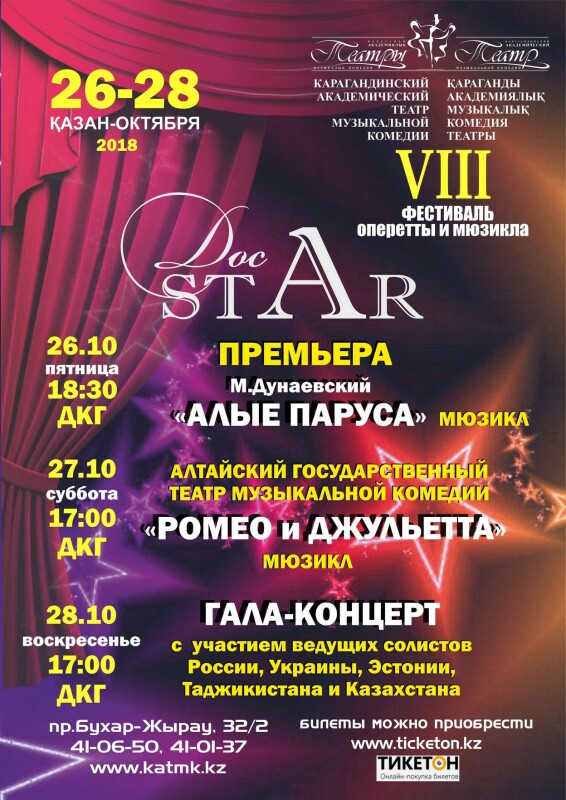 В рамках проведения XI Открытого фестиваля оперетты и мюзикла «DosStar» состоится гала-концерт с участием ведущих солистов из Казахстана (г. Нур-Султан), России (г. Калининград), Белоруссии (г. Минск), Италии, Франции. Концерт идет в сопровождении симфонического оркестра Карагандинского академического театра музыкальной комедии.