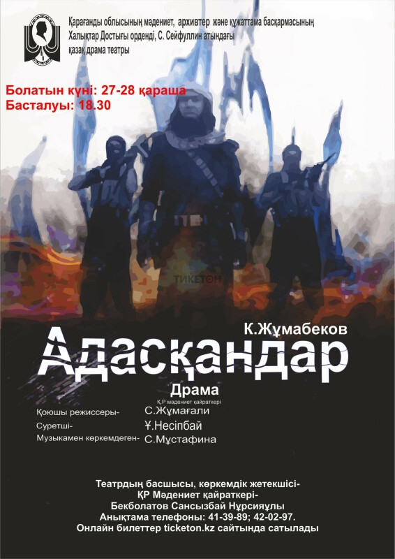 Драматург К.Жұмабековтің «Адасқандар» драмасы бүгінгі күннің болмысын ашып көрсетеді. Аты айтып тұрғандай, ислам дінін тереңдеп түсінбей, басқа ағымға түсіп кеткен жастардың қилы тағдыры шығарма өзегіне айналады. Өңгенің алдауы мен арбауына, азғыруына иланған қазақтың қаршадай қыздары мен жігіттері, «байимын, машина, үй сатып аламын» деп жүріп, жауыздардың қақпанына, қанды шеңгеліне қалай түскенін білмей, тығырықтан шығатын жол іздеп аласұрады. Екі көздері жәудіреп, туған жердің топырағын, ата-ананың аялы алақанын аңсайды. Оларды алда қанды қырғын, жазықсыз жандарды қыру, жалған діни ағымның әр түрлі қатыгездігі күтіп тұрғанын кеш аңдайды. Бірақ, шегінерге жол жоқты. Олар өлтірмей кері қайтармайды. Міне, шығарманың өзегі – адаспас үшін он ойланып жүз толғану керектігін еске салады, адаспауға үндейді.