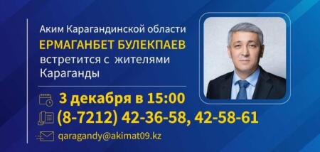 Встреча главы региона с жителями города Караганды состоится 3 декабря 2025 года. Мероприятие начнётся в 15:00 во Дворце культуры горняков. Для предварительного сбора вопросов и предложений от населения создана рабочая группа. Обращения можно направить одним из способов: - По телефонам: (8-7212) 42-36-58, 42-58-61. Время работы: в будние дни с 09:00 до 18:30 (обеденный перерыв с 13:00 до 14:30)- По электронной почте: [email protected] Все поступившие об...