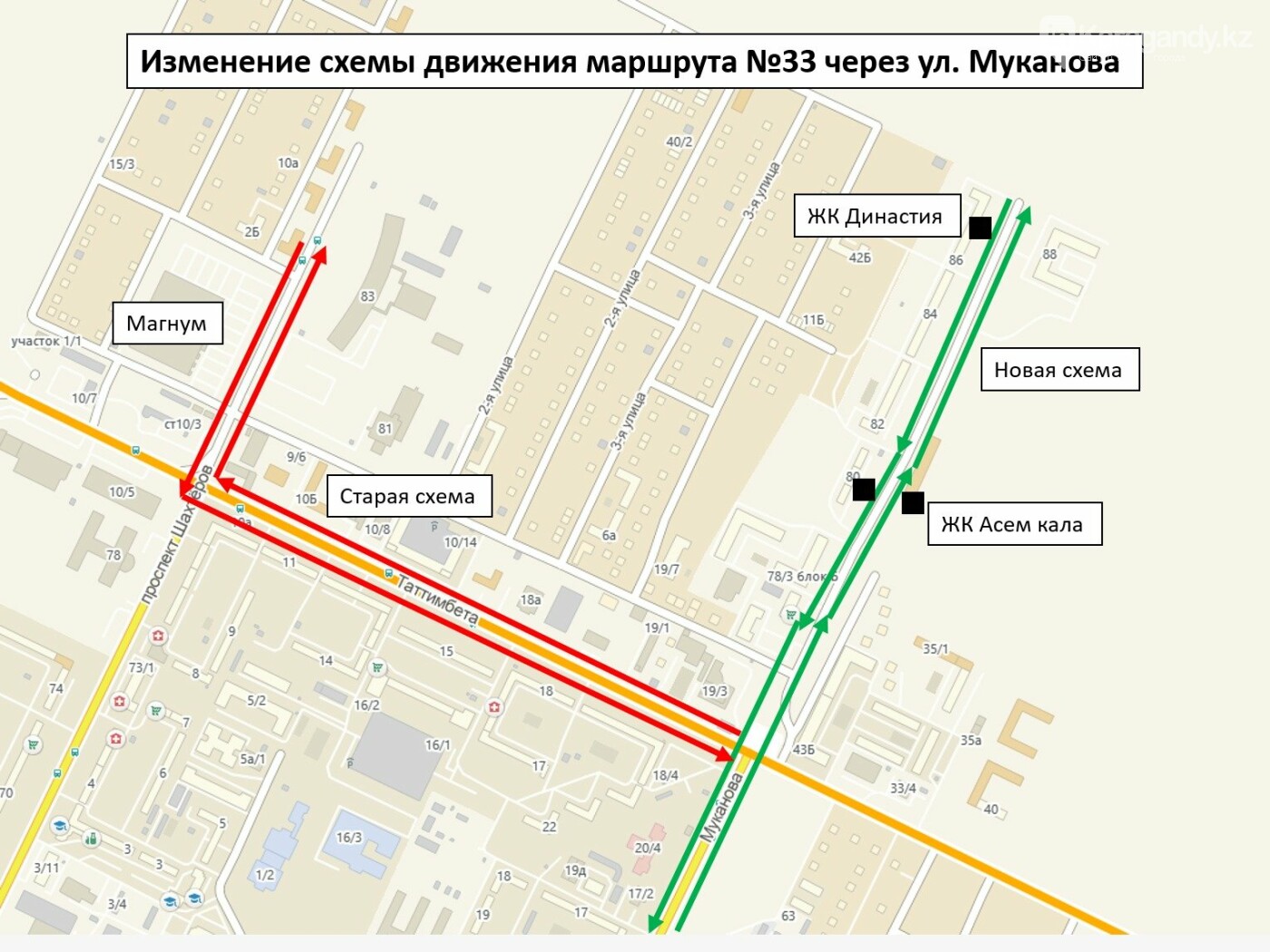 Конечная остановка маршрута переносится с «ТД Магнум» на «ЖК Династия». В связи с этим автобус больше не будет заезжать на остановки «ТД Магнум», «улица Таттимбета» и «Гаражи-2».